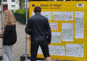 Wenn ein großer Bus direkt auf den Schulhof fahren darf, kann das nur der Demokratiebus sein. Ein Politikwissenschaftler erklärte den beiden achten Klassen die Thesen des Wahl-O-Mates und danach durften die Schüler diese an großen Tafeln bewerten. Am Ende wurden kleine Listen mit Parteiempfehlungen des Wahl-O-Mates gedruckt. So konnten sich die Schüler einen Eindruck verschaffen, welche Partei für sie zur Europawahl infrage kommen. Anschließend wertete die jeweilige Lehrkraft im Klassenraum neutral die Ergebnisse aus und es gab weiteren Wissenszuwachs im Politikunterricht.