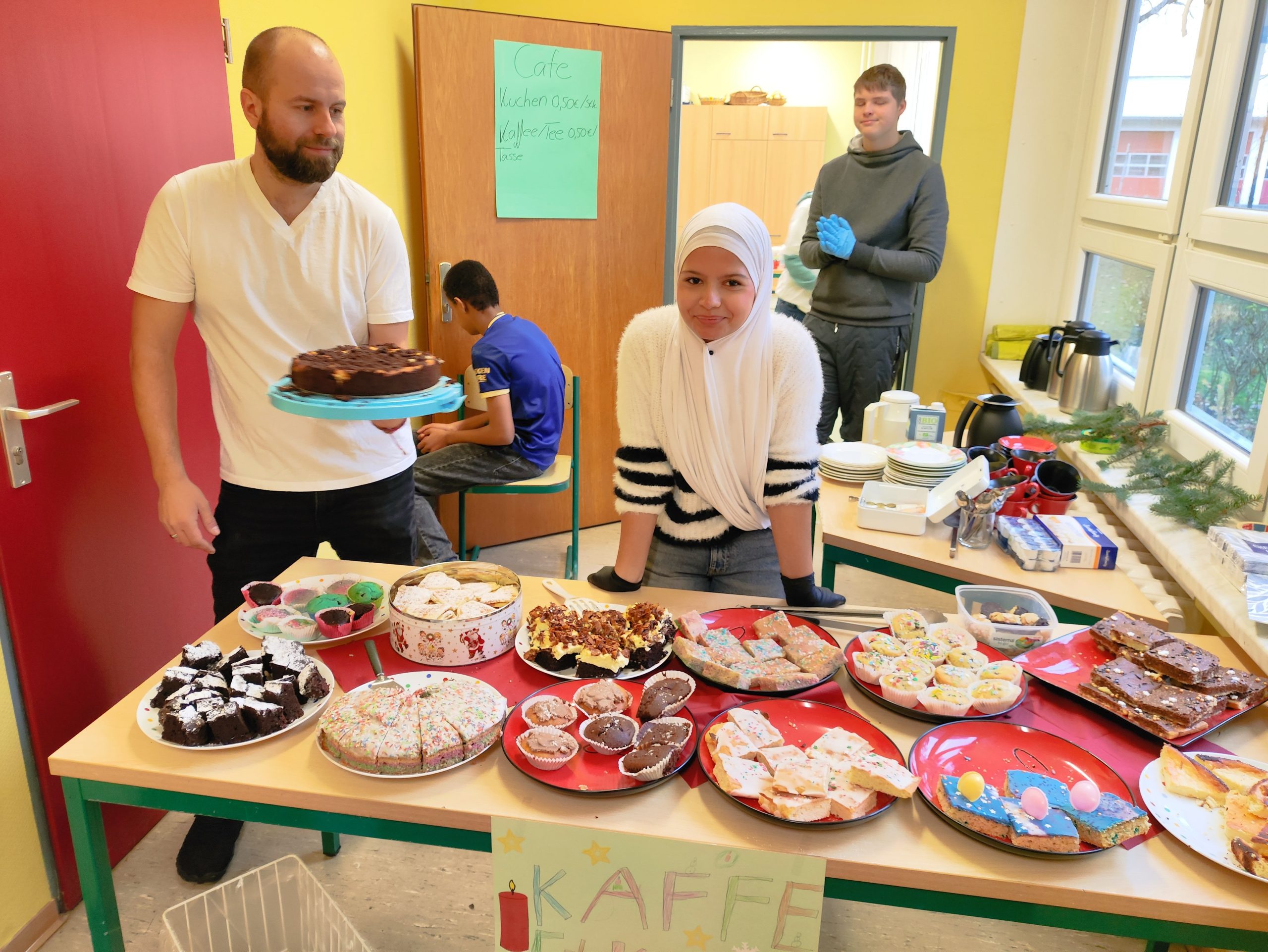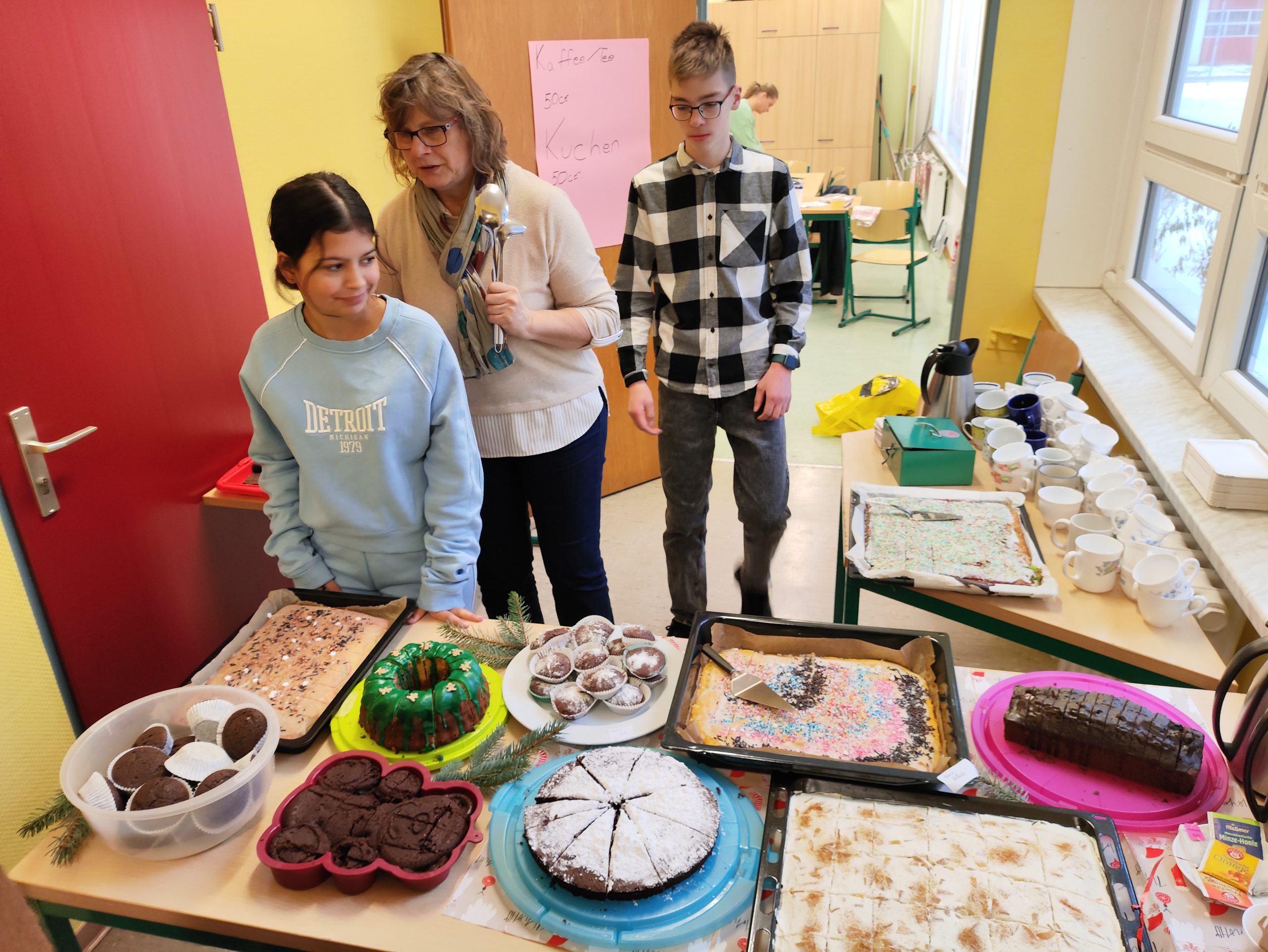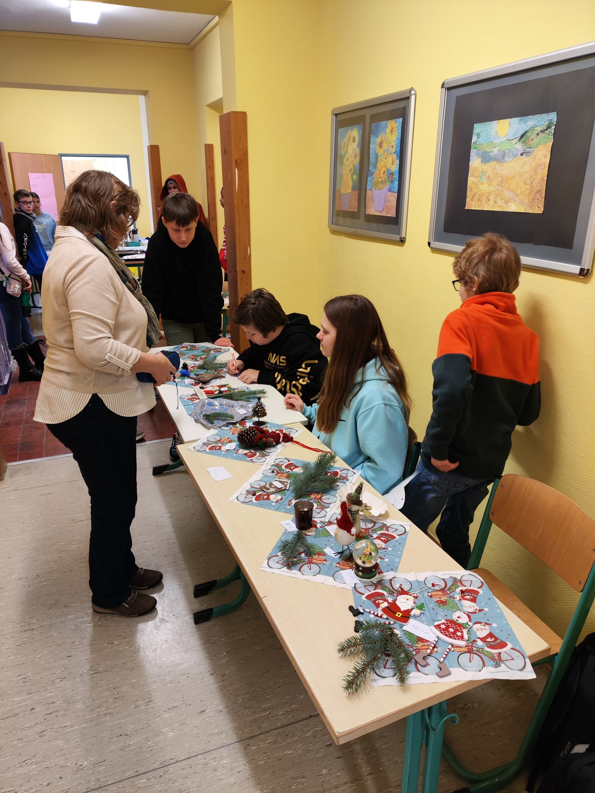 Der Nikolausbasar öffnete nach langer Corona-Zwangspause endlich wieder seine Pforten. Die Angebote für Eltern, Kollegen und Schüler waren reichhaltig und ganz sicher war für jeden etwas dabei. Die Schüler konnten auf Flohmärkten ihre erarbeiteten Werkstücke verkaufen, es gab eine Kinovorführung, ein Spielezimmer, verschiedene Bastelangebote und den sehr gut besuchten Kuchenbasar.