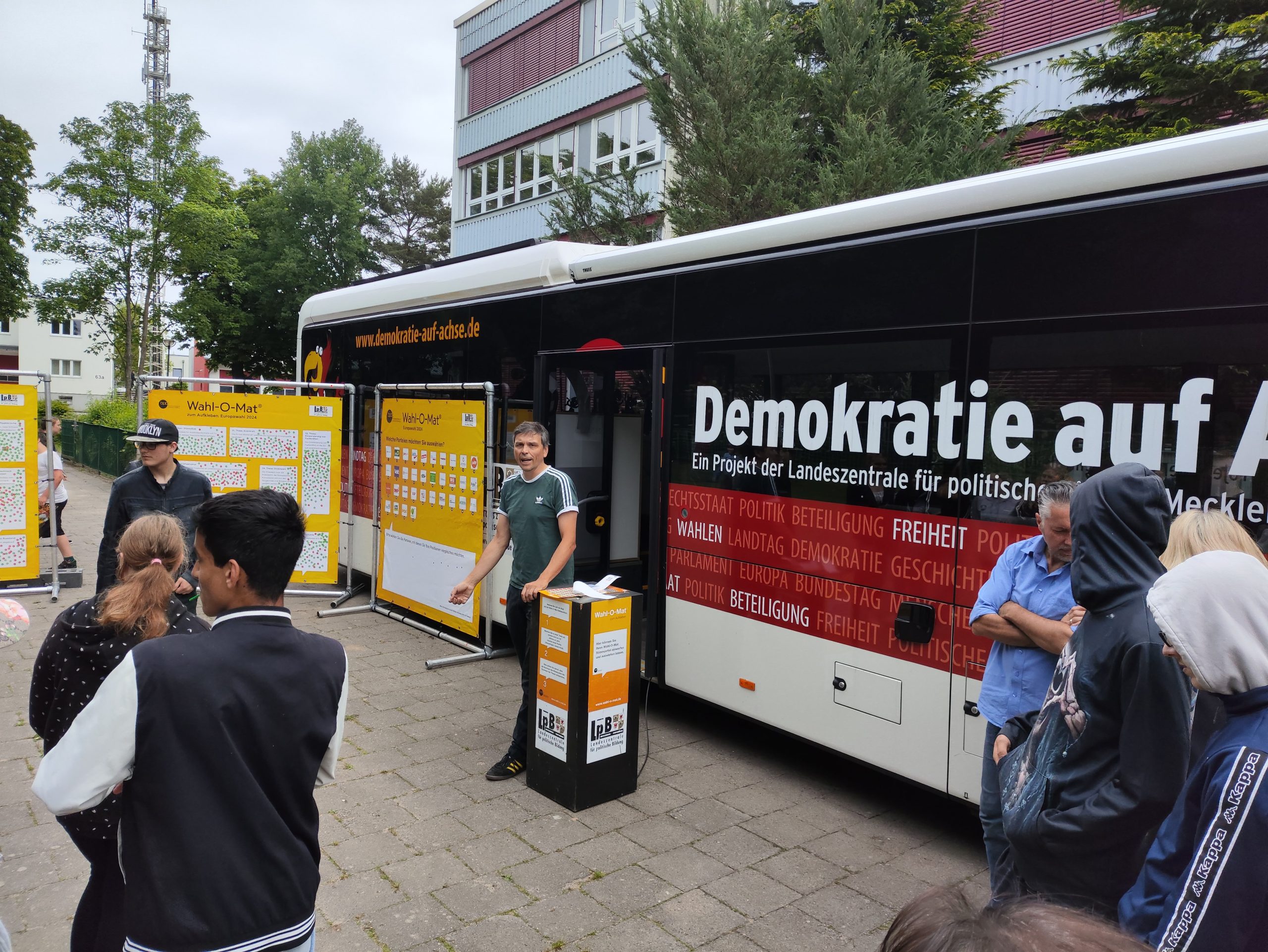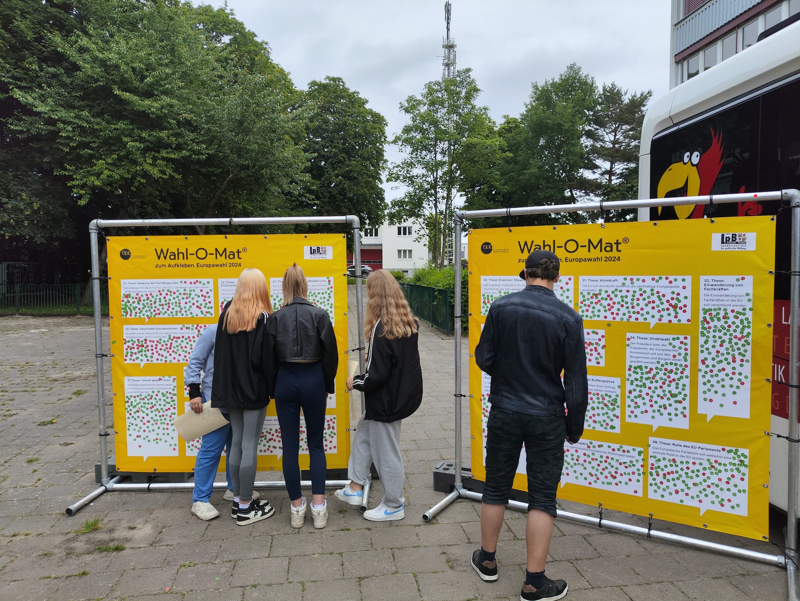 Wenn ein großer Bus direkt auf den Schulhof fahren darf, kann das nur der Demokratiebus sein. Ein Politikwissenschaftler erklärte den beiden achten Klassen die Thesen des Wahl-O-Mates und danach durften die Schüler diese an großen Tafeln bewerten. Am Ende wurden kleine Listen mit Parteiempfehlungen des Wahl-O-Mates gedruckt. So konnten sich die Schüler einen Eindruck verschaffen, welche Partei für sie zur Europawahl infrage kommen. Anschließend wertete die jeweilige Lehrkraft im Klassenraum neutral die Ergebnisse aus und es gab weiteren Wissenszuwachs im Politikunterricht.